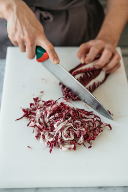 1) Mondate il radicchio e immergetelo in una ciotola con acqua e ghiaccio per 1 ora, in questo modo si affievolirà il gusto amarognolo; scolate le foglie, asciugatele e tenete da parte 12 foglioline interne, le più tenere, che serviranno per preparare le chips di guarnizione. Tagliate sottilmente le altre e cuocetele in un pentolino; aggiungete lo zucchero e i semini dalla vaniglia prelevati con la punta di un coltellino; cuocete a fiamma bassa per circa 10 minuti, fate addensare lo sciroppo mescolando, prelevatelo con un cucchiaio e versatelo in una ciotolina. Poi lasciate sobbollire il radicchio per circa 30 minuti, finché sarà ridotto a composta.