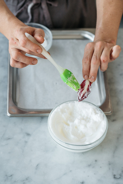 2) Preparate le chips per la guarnizione: in una ciotola montate con la frusta elettrica l'albume a neve; spennellate una foglia per volta presa dal cuore del radicchio e cospargetela con lo zucchero su entrambi i lati. Foderate una teglia con carta da forno, distribuite le foglioline e trasferite in forno a 70° per 30 minuti.