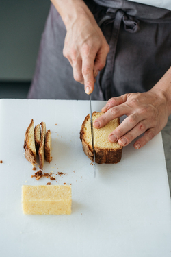 3) Per la torta, montate con la frusta elettrica il burro ammorbidito con lo zucchero a velo e i tuorli. A parte montate le uova con lo zucchero, poi unitele alla crema. Aggiungete fecola, farina e lievito setacciati, un pizzico di sale e continuate a mescolare con la frusta a mano. Foderate uno stampo di cm 13x33 con carta da forno, distribuite un filo d'olio e versatevi il composto, livellatelo con la spatola e trasferite in forno già caldo a 155° per 40 minuti. Dopo aver lasciato raffreddare la torta su una gratella, ricavatene 6 porzioni di cm 8x2,5x2,5 circa.