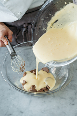 4) Per la crema di gianduia, fate bollire il latte in un pentolino, sbattete i tuorli con lo zucchero e versatevi il latte bollente; cuocete a bagnomaria, mescolando con una frusta, fino ad arrivare alla temperatura di 80°. Togliete la ciotola dal bagnomaria, unite i fogli di gelatina precedentemente ammorbiditi in acqua fredda, scolati e ben strizzati e versate la crema sul cioccolato gianduia. Mescolate finché gli ingredienti saranno ben amalgamati, poi mettete la ciotola a bagno in acqua e ghiaccio. Montate appena la panna e amalgamatela alla crema di gianduia, riempite una tasca da pasticciere con il composto e trasferitelo in frigo per 4 ore.