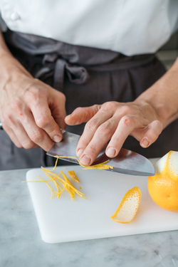 5) Lavate e asciugate l'arancia, poi con un pelapatate prelevate 2 scorze, eliminate la parte bianca con un coltello affilato e tagliatele a julienne.