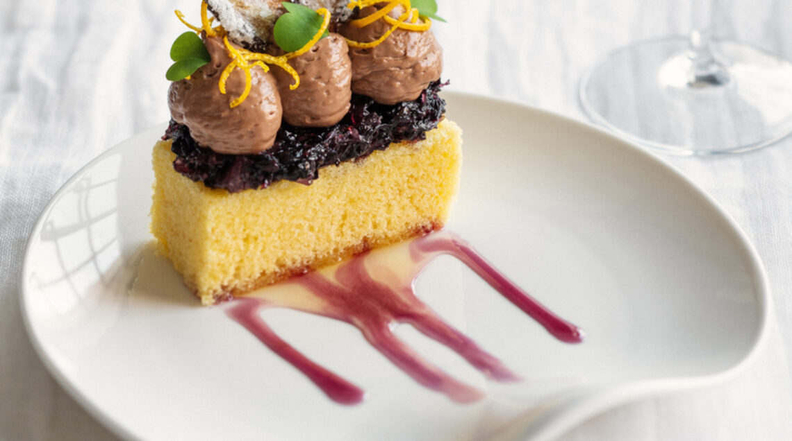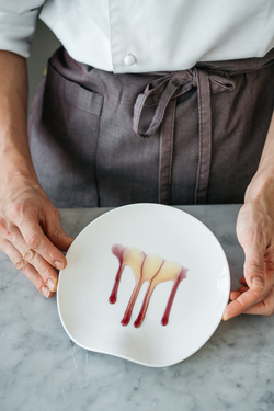 6) Distribuite su ogni piattino, nella parte superiore, 3 gocce di miele alternate a gocce di sciroppo di radicchio; inclinate il piatto così che i liquidi colino formando un disegno. Posizionate sulla parte superiore la porzione di torta e coprite la superficie con la composta di radicchio. Completate con gli spumoni di crema di gianduia, i riccioli di scorza d'arancia, le chips di radicchio e, se vi piace, qualche fogliolina di acetosella.
