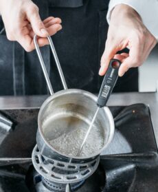 4) Preparate la glassa: mettete la gelatina a bagno in acqua fredda, versate in un pentolino 30 ml di acqua, unite lo zucchero e portate il tutto a 110°; quindi toglietelo dalla fiamma e aggiungete il cacao setacciato e la gelatina scolata e strizzata. Mescolate. Portate a bollore la panna con il miele, fate raffreddare a 45° e uniteli al composto di cacao, mescolando con delicatezza.