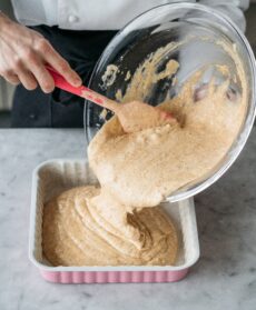 3) Imburrate e cospargete di amido di mais una teglia quadrata con il bordo ondulato (cm 25x25x4,5h) e versatevi l'impasto preparato; quindi trasferite in forno ventilato già caldo a 170° e fate cuocere per 45 minuti.