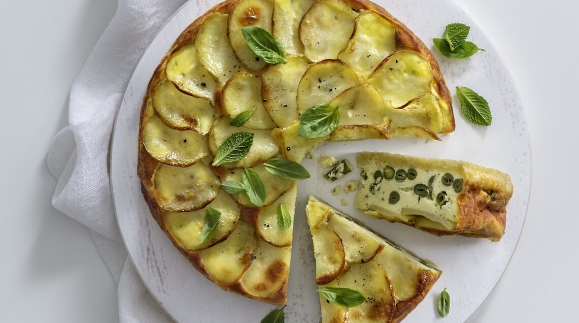 Una delizia vegetariana con una base di pane, farcita con crema al formaggio e decorata con fettine di patate. Squisita anche fredda