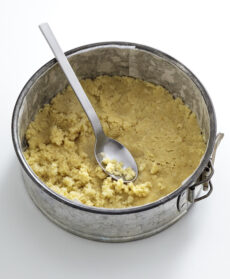 Appoggiate lo stampo vuoto su un foglio di carta da forno; traccia il contorno, taglia il disco e sistemalo sul fondo imburrato. Posizionate il bordo removibile, imburratelo e rivestitelo con una fascia in misura di carta da forno. Il burro farà aderire perfettamente la carta allo stampo e avrai bordi perfetti.