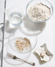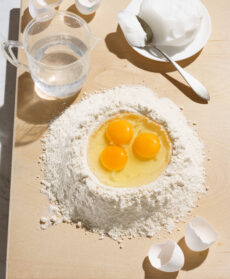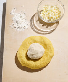 Mescolate la farina rimasta con i formaggi grattugiati e disponeteli a fontana sulla spianatoia.