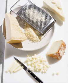 Grattugiate il parmigiano e il pecorino stagionato. Tagliate il pecorino fresco a dadini.