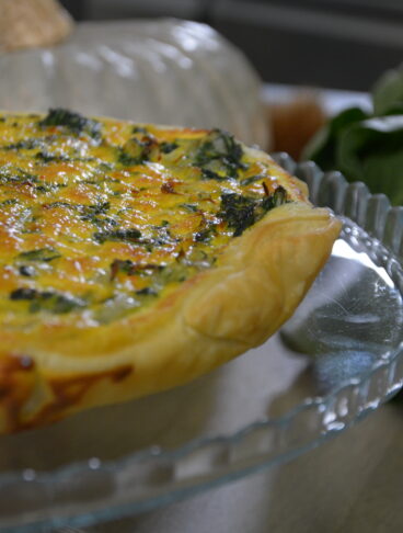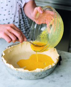 Stendete la sfoglia e foderate fondo e bordi di uno stampo di circa 24 cm di diametro. Versate sul fondo il composto di uova.