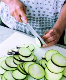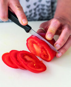 Affettate con un coltello il pomodoro, la melanzana, il peperone e i funghi.