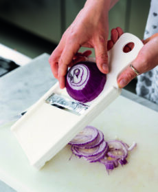 Tagliate la zucchina, la cipolla, la patata e la carota con la mandolina.