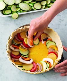 Disponetevi sopra le verdure preparate partendo dal bordo esterno e formando una spirale fino al centro, alternando i colori in modo armonico.