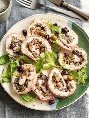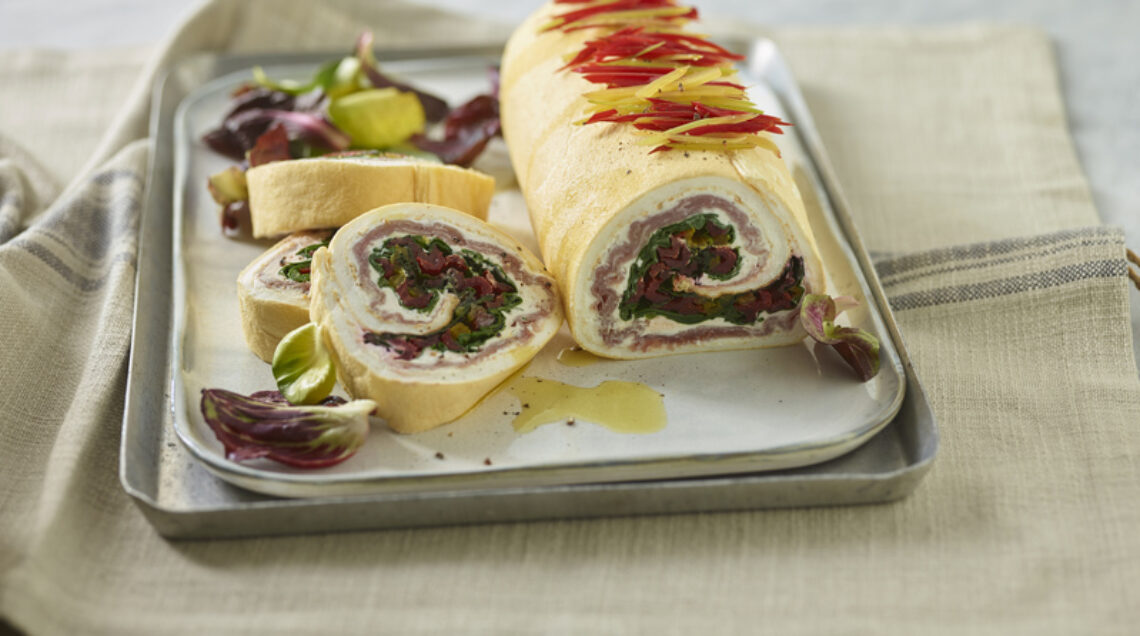 Farcito con coste, prosciutto crudo e robiola, il rotolo di albumi è perfetto da ì come antipasto, picnic o buffet