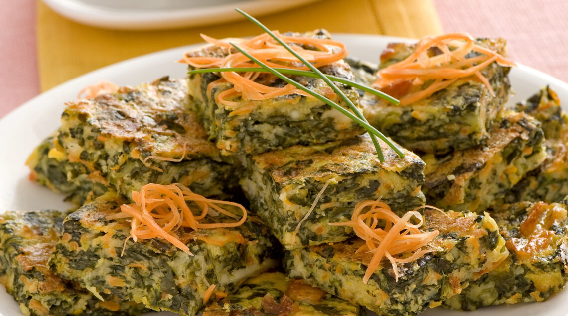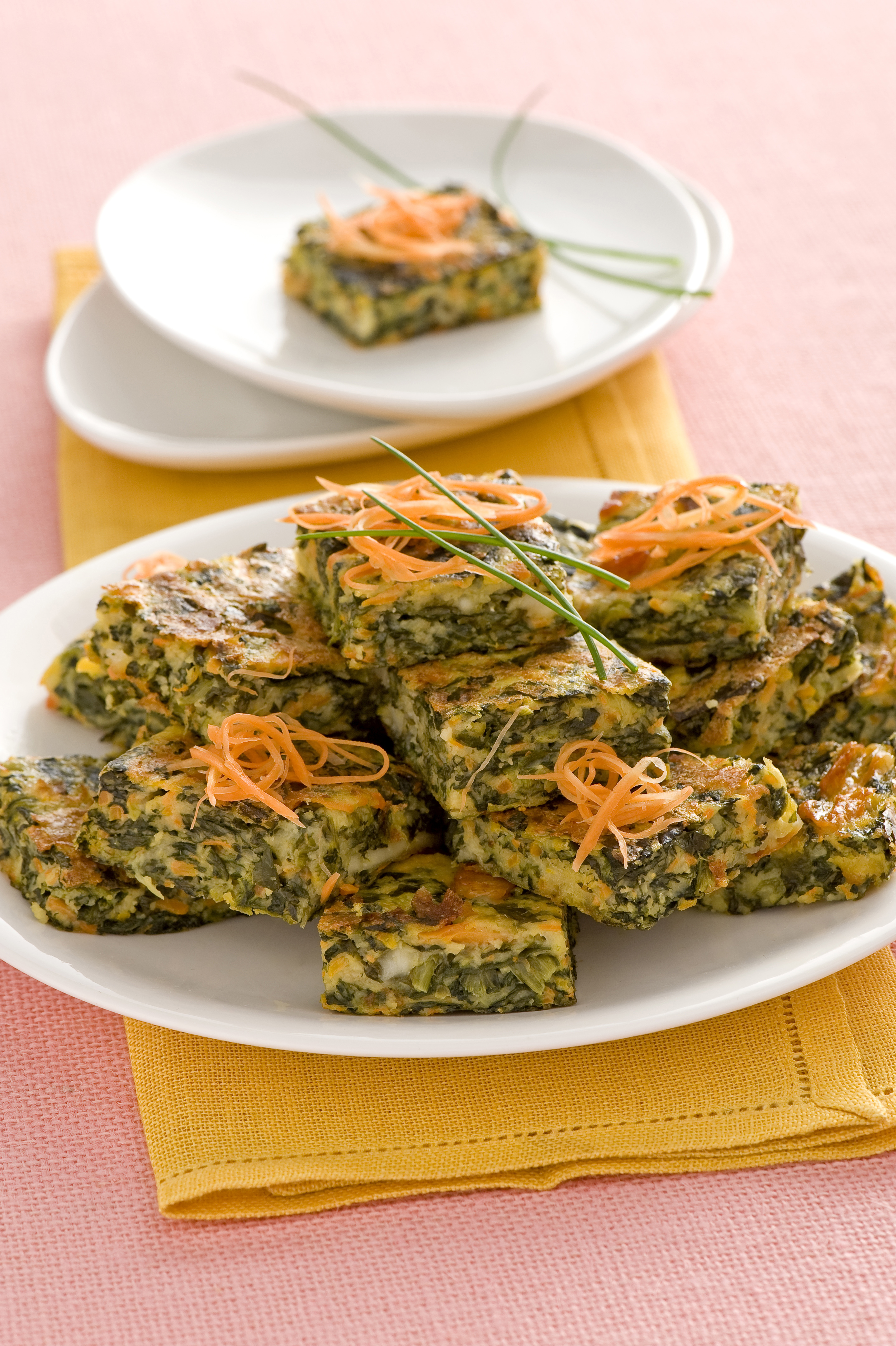 3) Versa il composto in una teglia rettangolare foderata con carta da forno, livellalo, distribuisci in superficie il burro a fiocchetti e passa in forno a 180° per 45 minuti. Lascia intiepidire leggermente poi servi lo sformato a quadrotti con le carote a julienne.