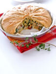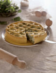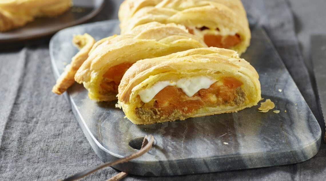 3) Richiudi sul ripieno i bordi di pasta lasciati liberi sui lati corti, eliminando le eccedenze troppo abbondanti. Quindi comincia a piegare le strisce di pasta oblique verso il centro alternando destra e sinistra in modo da formare una treccia che coprirà completamente il ripieno. Trasferisci la treccia su una teglia aiutandoti con la carta e cuocila nella parte bassa del forno a 180° per 35 minuti. Lasciala riposare la treccia di sfoglia con patè di olive verdi e zucca 5 minuti prima di servire.