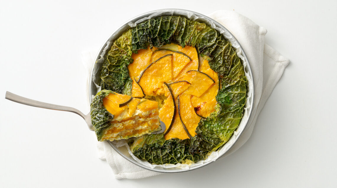 2 Tagliate la zucca a fettine e cuocetele in forno a 180° per 20 minuti, girandole a metà cottura. Sbattete le uova con il tuorlo, la panna fresca, 1 pizzico di sale e una macinata di pepe e unite i porri stufati. Foderate uno stampo di 22 cm di diametro con carta da forno bagnata e strizzata. Rivestite fondo e bordi dello stampo con le foglie di verza, facendole debordare.