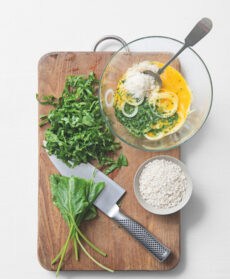 Versate gli ingredienti in una ciotola e mescolateli con il riso, le uova, il formaggio e 4 cucchiai di olio (potete usare olio extravergine di oliva Dop Riviera Ligure); salate e pepate.