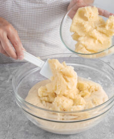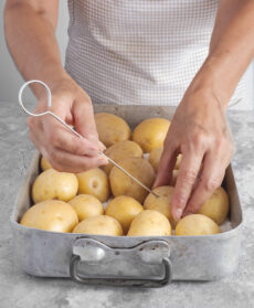 Versate il sale grosso in una teglia, unite le patate, punzecchiatele con uno spiedo e cuocetele in forno caldo a 220° per 1 ora. Fatele intiepidire, tagliatele a metà e ricavate la polpa prelevandola con un cucchiaio. Schiacciatela con lo schiacciapatate e lasciatela raffreddare.