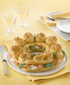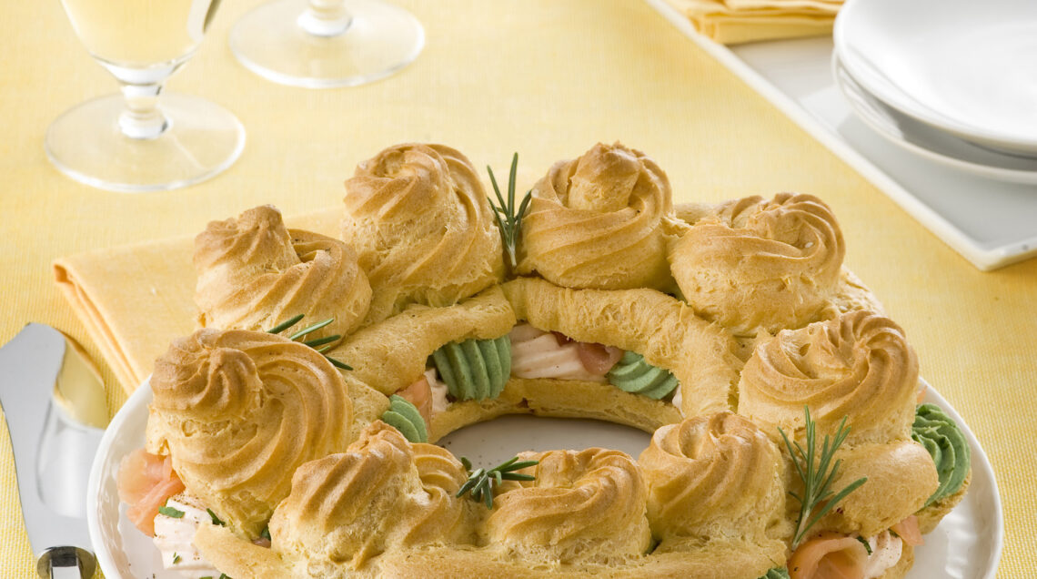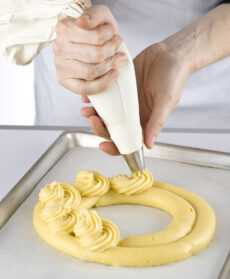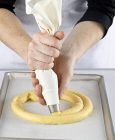 Porta a bollore 4 dl d’acqua con il burro, aggiungi la farina e lascia andare sul fuoco finché il composto si stacca dalle pareti della pentola. Unisci uno alla volta le 4 uova e amalgama il tutto. Versa metà del composto in una sacca da pasticcere con bocchetta liscia e forma 2 cerchi concentrici (cioè una corona doppia) su una placca rivestita di carta forno.