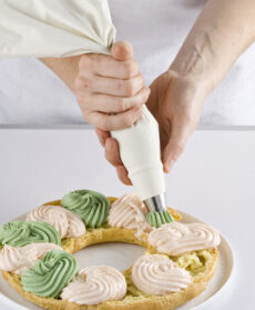 Versa anche la restante parte del composto nella tasca da pasticcere, sostituendo la bocchetta liscia con quella spizzata. Crea così dei grossi ciuffi di impasto che lascerai cadere sulla superficie della doppia corona. Cuoci per circa 30 minuti in forno preriscaldato a 200°, finché la pasta apparirà gonfia e dorata. Quindi sforna, lascia intiepidire e dividi a metà la corona, tagliando orizzontalmente.