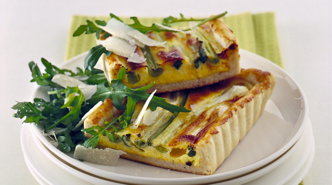 La ricetta è semplice, ma elegante al tempo stesso, da proporre per un pranzo in famiglia o un pic nic tra amici. Il guscio di pasta brisée è hand made, il ripieno a base di panna ha il sapore pungente e dolce dei cipollotti, quello amarognolo della rucola e quello deciso del Parmigiano.