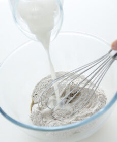 Mescolate in una ciotolina il latte con 1 cucchiaino di aceto e lasciatelo riposare per 10 minuti, mescolando di tanto in tanto. Mettete la farina in una ciotola capiente, versatevi a filo il mix di latte preparato, un pizzico di sale, 1 cucchiaino di burro fuso e 2 uova. Montate bene, in modo da ottenere una pastella liscia e omogenea. Fate riposare per 30 minuti.