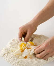 Lavora il composto dapprima con le punte delle dita e poi a piene mani fino a farlo diventare omogeneo. Avvolgi il panetto in una pellicola e fallo riposare per 30 minuti.