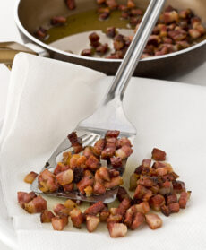 Rosola i 150 g di pancetta a dadini e asciugali con carta da cucina.