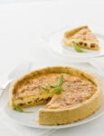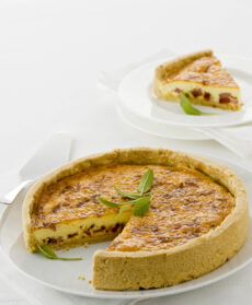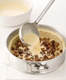 Una volta estratta la quiche distribuisci sul fondo la pancetta rosolata precedentemente, versa il composto di formaggio e uova e inforna nuovamente per altri 25 minuti.