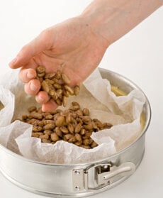 Ora è il momento di stendere la pasta. Infarina il piano di lavoro e stendi velocemente la pasta in una sfoglia sottile tenendo presente che il cerchio della pasta coprirà il fondo della tua teglia da crostata e dovrà fuoriuscire di circa 2 cm dai bordi. Con un mattarello arrotola la sfoglia e sistemala su una tortiera a cerniera di 24 cm, precedentemente imburrata e infarinata. Taglia la pasta in eccesso, punzecchia con una forchetta la pasta brisé e coprila con carta da forno dove sistemerai dei fagioli secchi e inforna a 180° per 10 minuti.