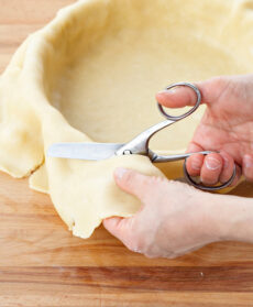 Stendete la pasta sulla spianatoia infarinata allo spessore di 2-3 mm. Foderate una teglia rotonda con carta da forno bagnata e strizzata, sistematevi la pasta, fatela aderire sul fondo e intorno ai bordi, tagliate la parte eccedente con le forbici e mettete il tutto in frigorifero.