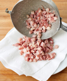 Immergete i dadini di pancetta in acqua in ebollizione in modo che perdano parte del grasso, scolateli dopo pochi istanti su carta assorbente da cucina e asciugateli bene. Scaldate una padellina antiaderente e fatevi rosolare velocemente i dadini di pancetta.