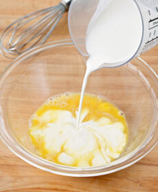 Sgusciate le uova in una ciotola, unite un pizzico di sale, pepe e una grattata di noce moscata; sbattetele leggermente, aggiungete la panna a filo, completate con il gruyère grattugiato con la grattugia a fori grossi e amalgamate il tutto con una frustina.