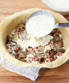 Riprendete la teglia dal frigorifero e distribuite sul fondo della pasta i dadini di pancetta e metà dei funghi (che avrete lasciato raffreddare); versatevi sopra il composto di panna e uova con un mestolino per evitare di bagnare i bordi della pasta.