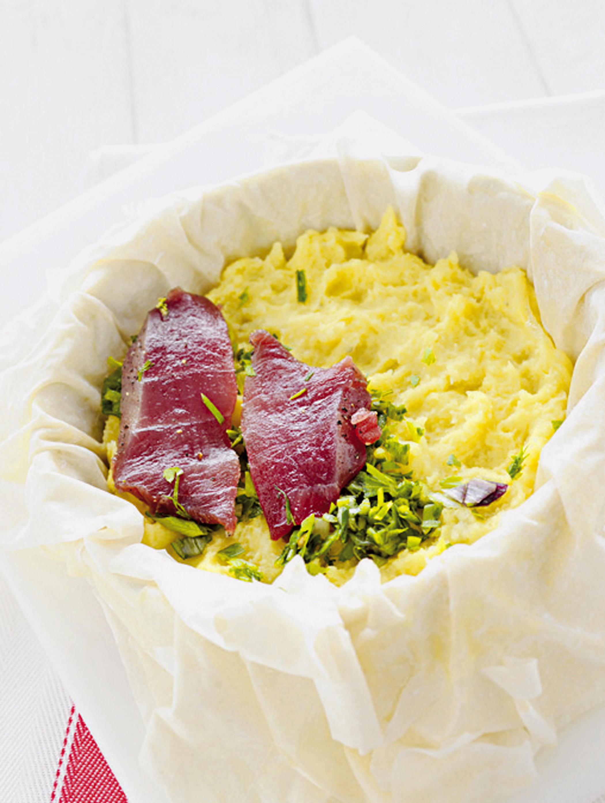 2) Ungi con un po’ d’olio una tortiera e ricoprila con 2 fogli di pasta fillo sovrapposti, anch’essi spennellati d’olio. Copri la pasta con metà del composto a base di patate, poi aggiungi il tonno sgocciolato e tagliato a fette, infine un secondo strato di purè di patate. Copri con i 2 restanti fogli di pasta fillo spennellati d’olio. Chiudi ripiegando i bordi all’interno dello stampo. Cuoci per 40 minuti in forno preriscaldato a 200°.