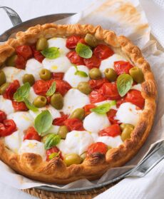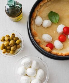 Togli la sfoglia dal forno, elimina carta e fagioli, aggiungi i pomodorini con la parte bombata verso l'alto, alternandoli con i bocconcini di mozzarella e le olive. Irrora con un filo d'olio, distribuisci qua e là le foglie di basilico e passa di nuovo in forno a 180° per 20 minuti.