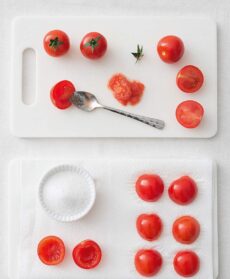 Per preparare la sfogliata napoletana inizia lavando i pomodorini, tagliali a metà, elimina i semini, salali internamente, mettili a sgocciolare capovolti e poi asciugali con carta da cucina. Taglia a metà le mozzarelline e asciuga anch'esse con cura.