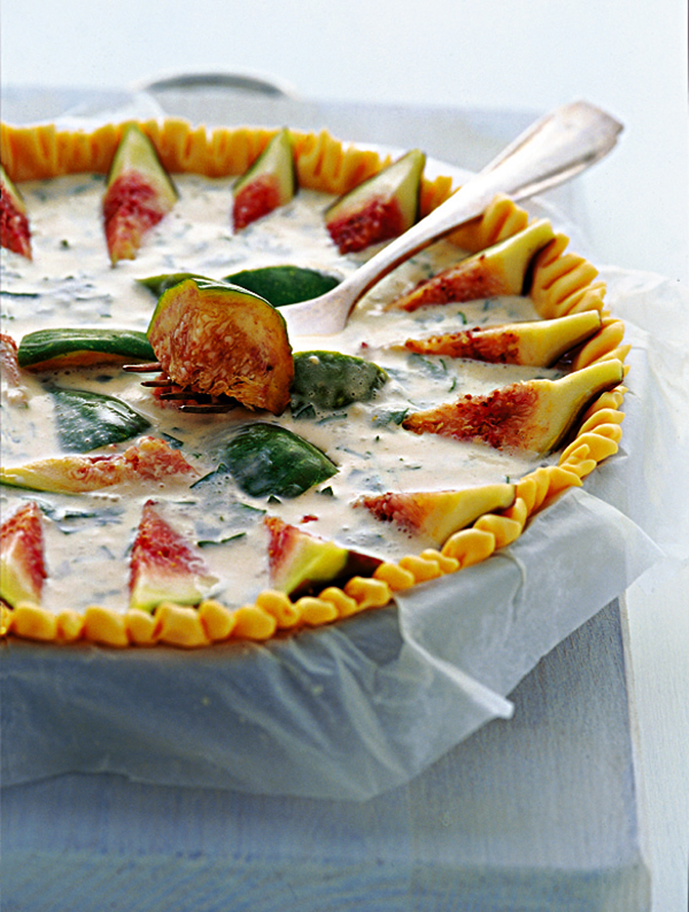 2) Cospargi il fondo della sfogliata rustica con il pangrattato e versaci sopra la pastella al gorgonzola. Lava poi i fichi, asciugali e tagliane ciascuno in 4 spicchi, che disporrai sopra la crema al gorgonzola. 3) Cuoci la sfogliata rustica in forno preriscaldato a 200° per circa 40 minuti, e lasciala intiepidire prima di servire.