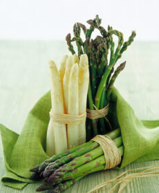 Pela i gambi degli asparagi con uno sbucciatore o un pelapatate; allineali sul tagliere, pareggiali tagliando via la parte più coriacea finale e lavali. Tienine 2 da parte; scotta gli altri in acqua bollente salata per pochi minuti e falli raffreddare in una ciotola con acqua e ghiaccio; scolali e asciugali bene.
