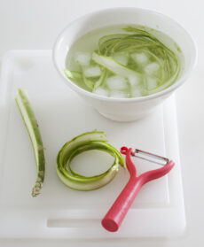 Affetta gli asparagi crudi con un pelapatate nel senso della lunghezza e raccogli le strisce in un'altra ciotola piena d'acqua e ghiaccio: serviranno per guarnire il piatto.