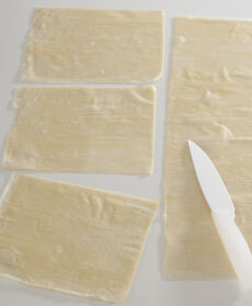 Spennella un foglio di pasta fillo con il burro fuso, sovrapponine un altro, spennella anche questo e sistemavi sopra l'ultimo strato; taglia il tris di sfoglie a metà nel senso della lunghezza e poi dividi ciascuna metà in parti uguali: dovrai ottenere 6 quadrati di 15 cm di lato.