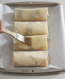 Distribuisci su ogni quadrato gli asparagi tagliati a pezzi di sbieco, la scamorza, il basilico, il salmone e la mozzarella; sala, pepa, arrotola le sfoglie sul ripieno e sigilla le estremità. Adagia gli strudel sulla placca foderata con carta da forno bagnata e strizzata, spennellali con il burro fuso rimasto e infornali a 200° per 15 minuti.