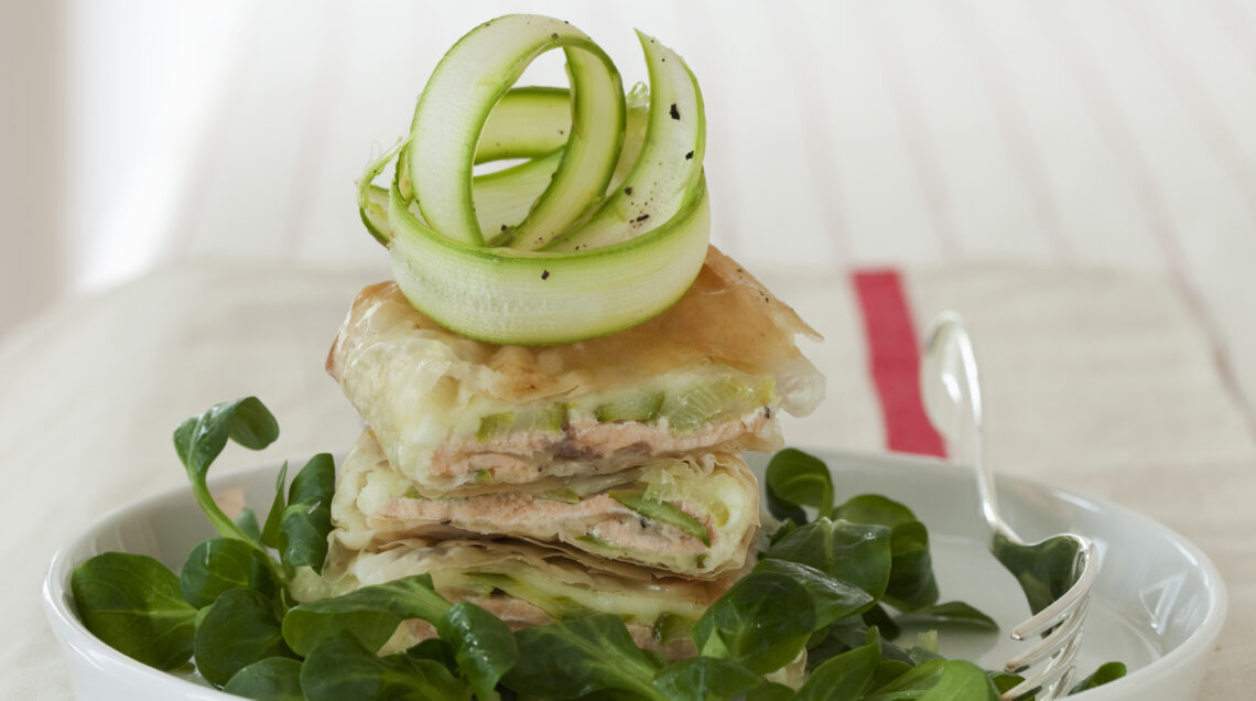 Servi gli strudel di pasta fillo, asparagi e salmone tagliati a quadrotti nei piatti individuali su un letto di songino condito con sale, pepe e un filo d'olio. Guarnisci con le strisce di asparago sgocciolate e asciugate e condite con sale, pepe e olio.