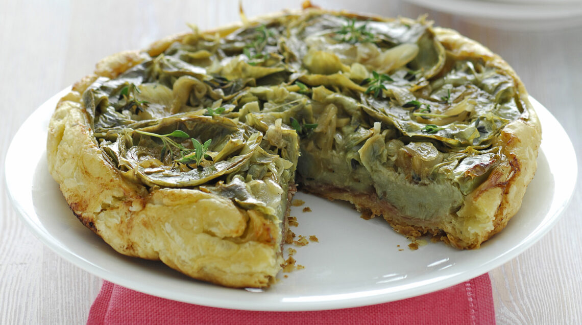 1) Per preparare la tatin al prosciutto crudo e aromi pulisci i carciofi, elimina i gambi, il fieno e i 2/3 della lunghezza delle foglie. Mettili in acqua e limone.