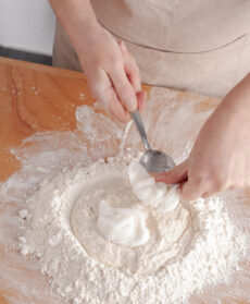Il giorno prima, sciogliete il lievito in 50 ml di acqua tiepida. Impastate 150 g di farina con 150 ml di acqua tiepida, poi unite il lievito sciolto, lo strutto, la farina restante e 50 ml di acqua tiepida in cui avrete sciolto 10 g di sale. Impastate per circa 20 minuti, poi formate un panetto, infarinatelo, disponetelo in una ciotola unta con olio, copritelo con un telo umido e lasciate lievitare per 2 ore a 26-28°. Sostituite il telo con pellicola e mettete in frigo per 8-10 ore.