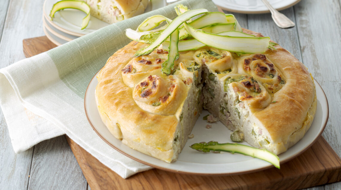 Il giorno successivo, passate l'impasto in forno caldo a 30° per 1 ora protetto con la pellicola. Intanto, preparate il ripieno: tagliate gli asparagi a tocchetti, tenete da parte qualche punta e saltate brevemente i restanti con il burro. Tritate la mozzarella e unitela agli asparagi tiepidi con il prosciutto tritato, la ricotta, l'uovo e 1 tuorlo; salate.