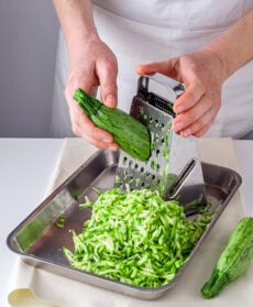 Sciacquate le zucchine, spuntatele dal lato opposto al picciolo e grattugiatele con la grattugia a fori grossi.