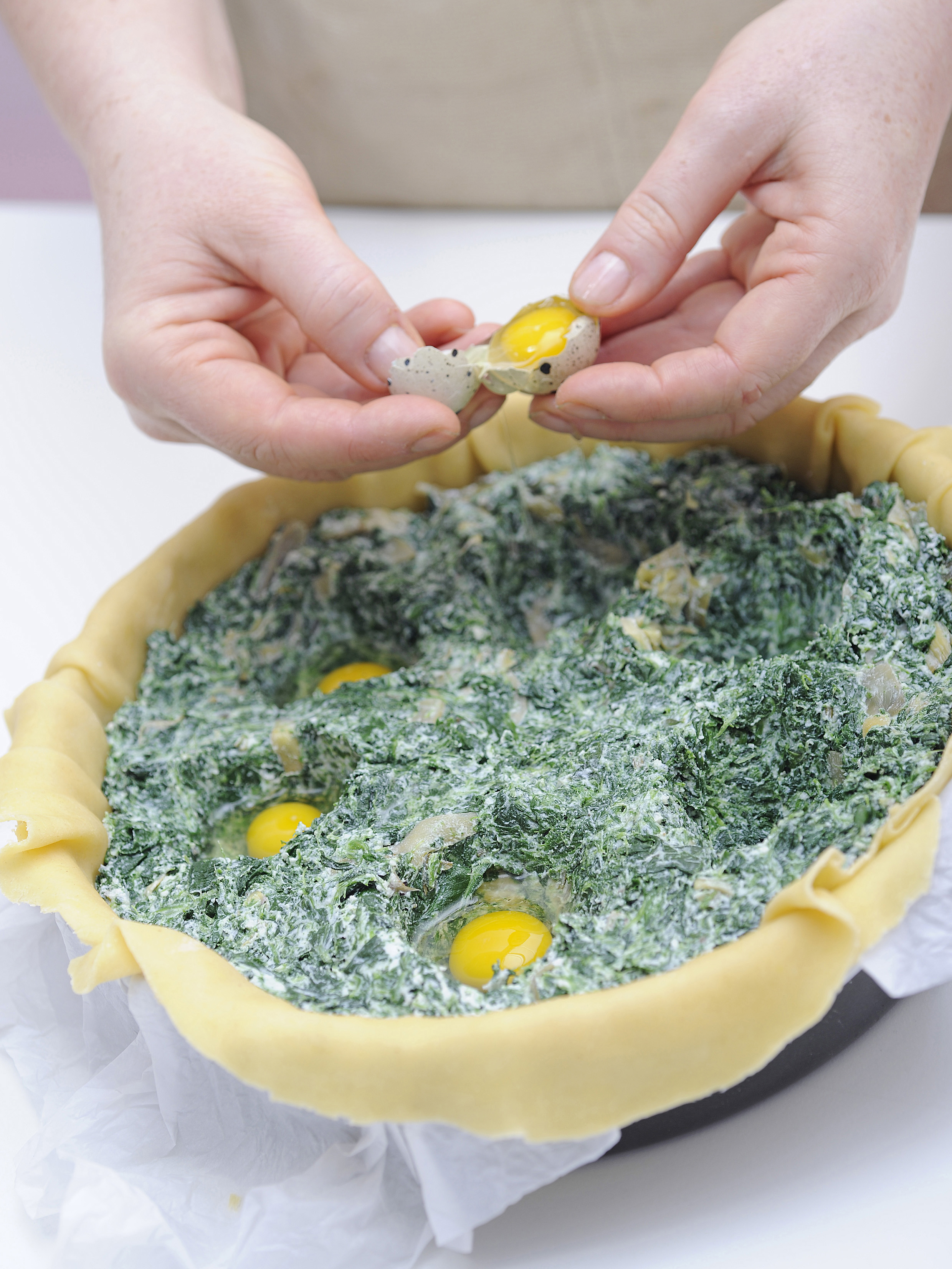 2) Rompi un uovo di quaglia in ognuna e condisci con il parmigiano rimasto, sale e pepe. Copri con le 2 sfoglie rimaste, sigilla i bordi dando loro la forma di un cordoncino e ungi d'olio la torta.