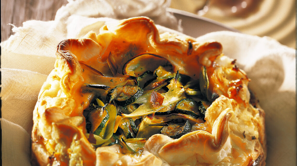 Pasta sfoglia pronta, stesa o surgelata, o pasta sfoglia fatta in casa: indispensabile che sia ben fredda prima di essere infornata in modo che in cottura diventi gonfia e croccante. Il ripieno di formaggi e verdure è legato con panna e uova e ha il sapore pungente del porro. Un piatto buono anche freddo.
