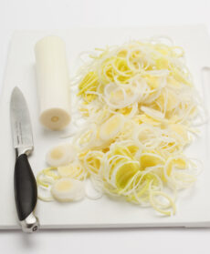 Eliminate la parte terminale verde dei porri e le radichette. Tagliate la parte bianca a fette sottilissime con un coltello affilato oppure con una mandolina.